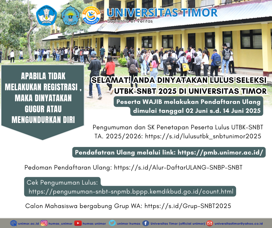 Hasil Ujian Tulis Berbasis Komputer Seleksi Nasional Berdasarkan Tes (UTBK SNBT) 2025 resmi diumumkan pada Rabu (28/5/2025) lalu. Sebanyak 846 calon mahasiswa baru lolos penerimaan masuk Universitas Timor (Unimor) melalui jalur UTBK SNBT 2025.